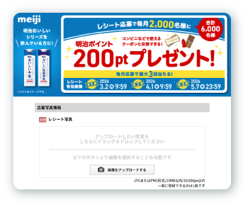 応募期間中に対象商品の中から1点以上購入し、その購入レシートを明治会員サービス内のキャンペーンページよりエントリーして応募すると、抽選で明治ポイント200ptが当たります。